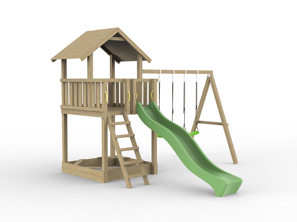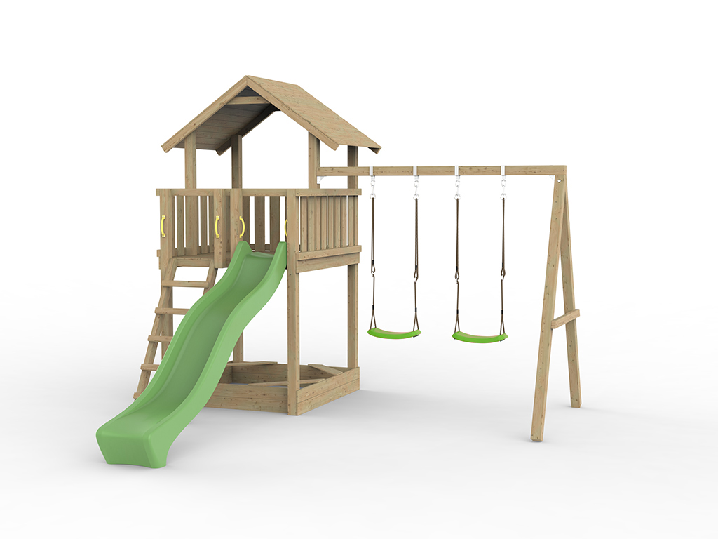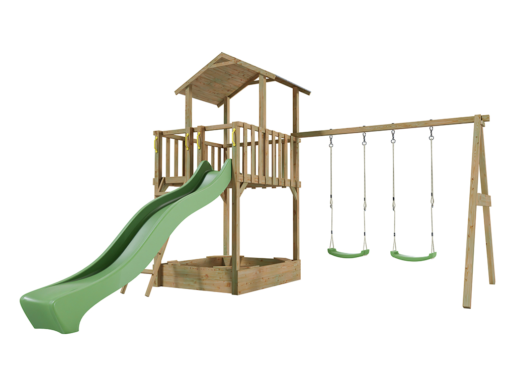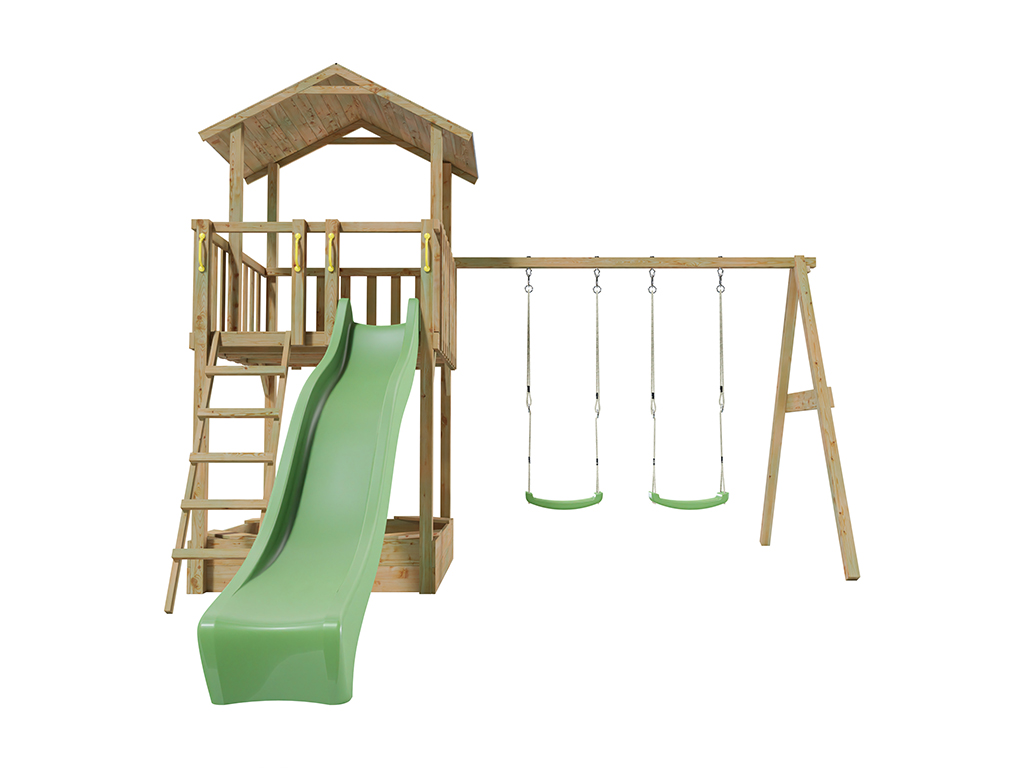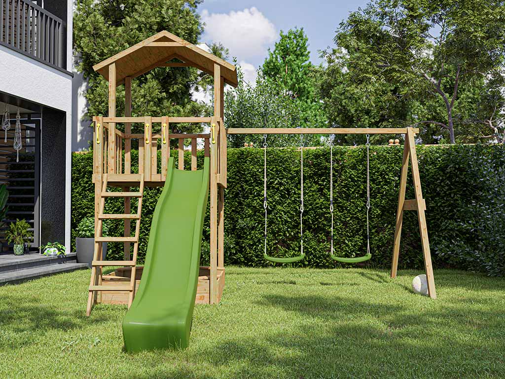Spielturm Tilly Classic mit Doppelschaukel KDI inkl. Rutsche grün + Sitze grün