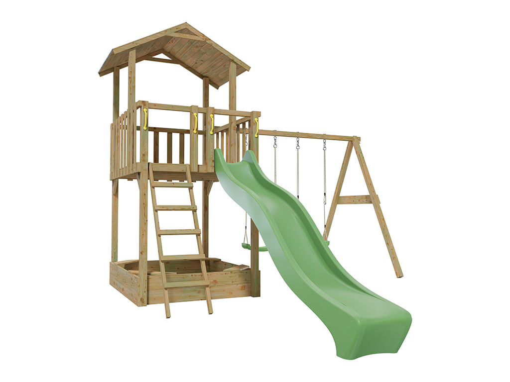 Eine 2,9 Meter lange, grüne Wellenrutsche für die Montage am Podest ist im Sparset bereits enthalten. Die Rutsche lässt sich mit wenigen Handgriffen in eine Wasserrutsche verwandeln. Hierfür befindet sich an der Unterseite der Rutsche ein Anschluss für den Gartenschlauch, der einmalig mit einem Bohrloch hergestellt werden kann. - Inklusive Sandkasten