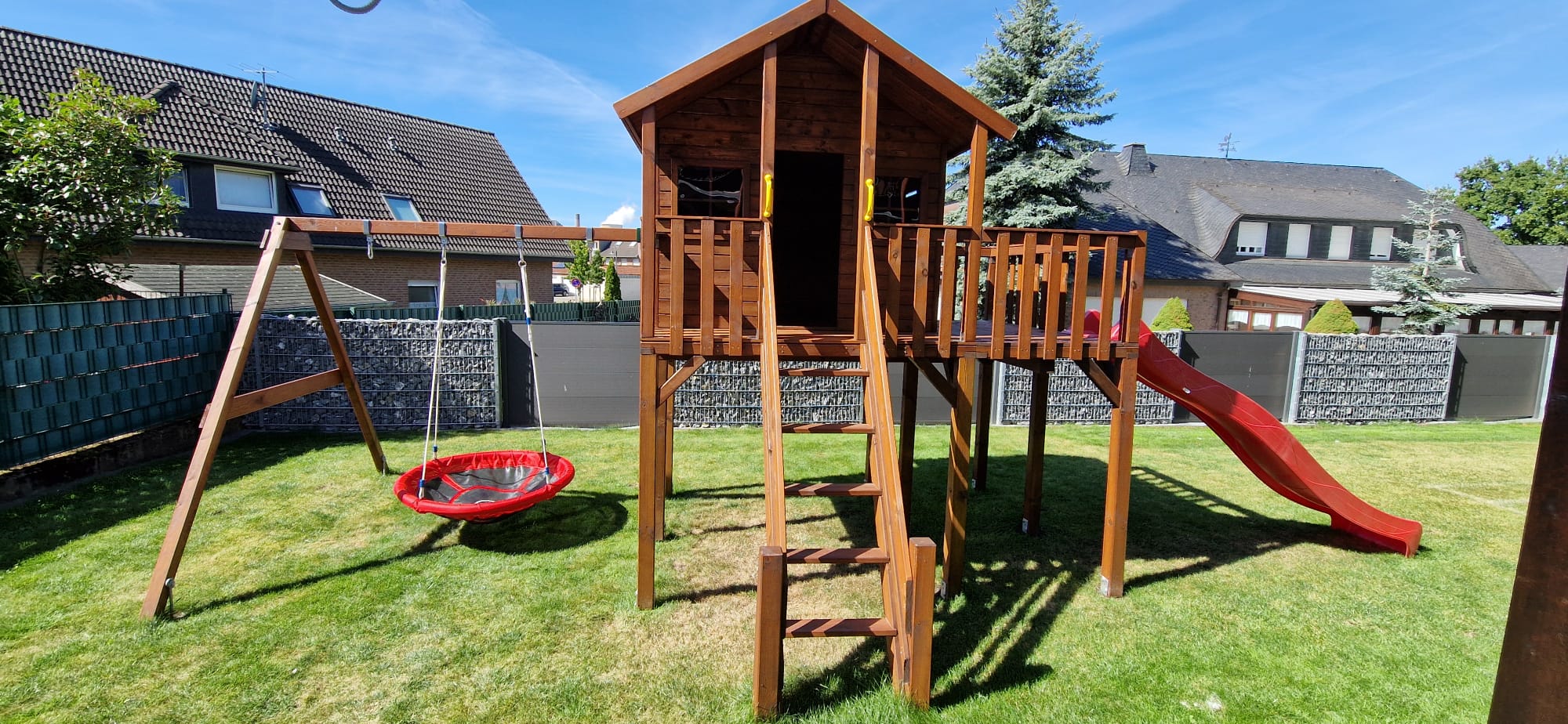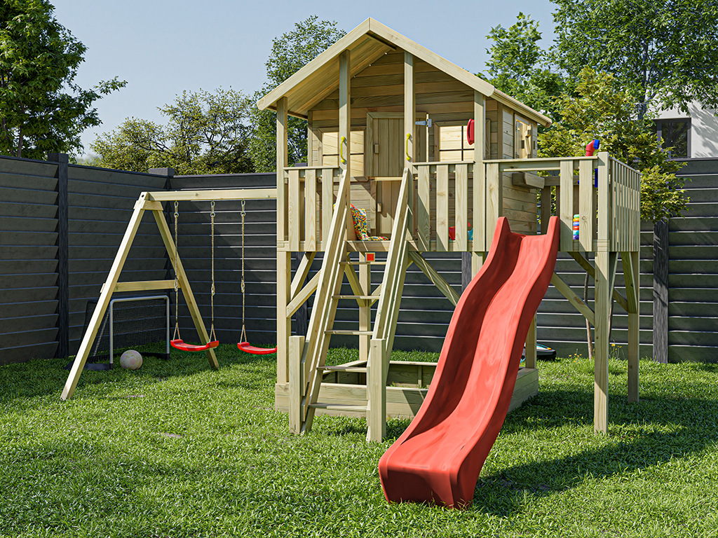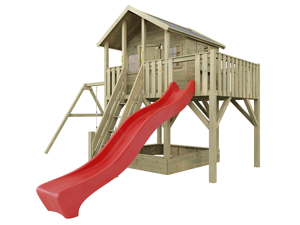 | Lieferumfang: | Stelzenhaus Big House XL, Leiter m. Handlauf, 1x Fensterläden, 1x Blumenkasten, Sandkasten, Rutsche rot, Doppelschaukel mit 2 Schaukelsitzen rot, detaillierte Montageanleitung |