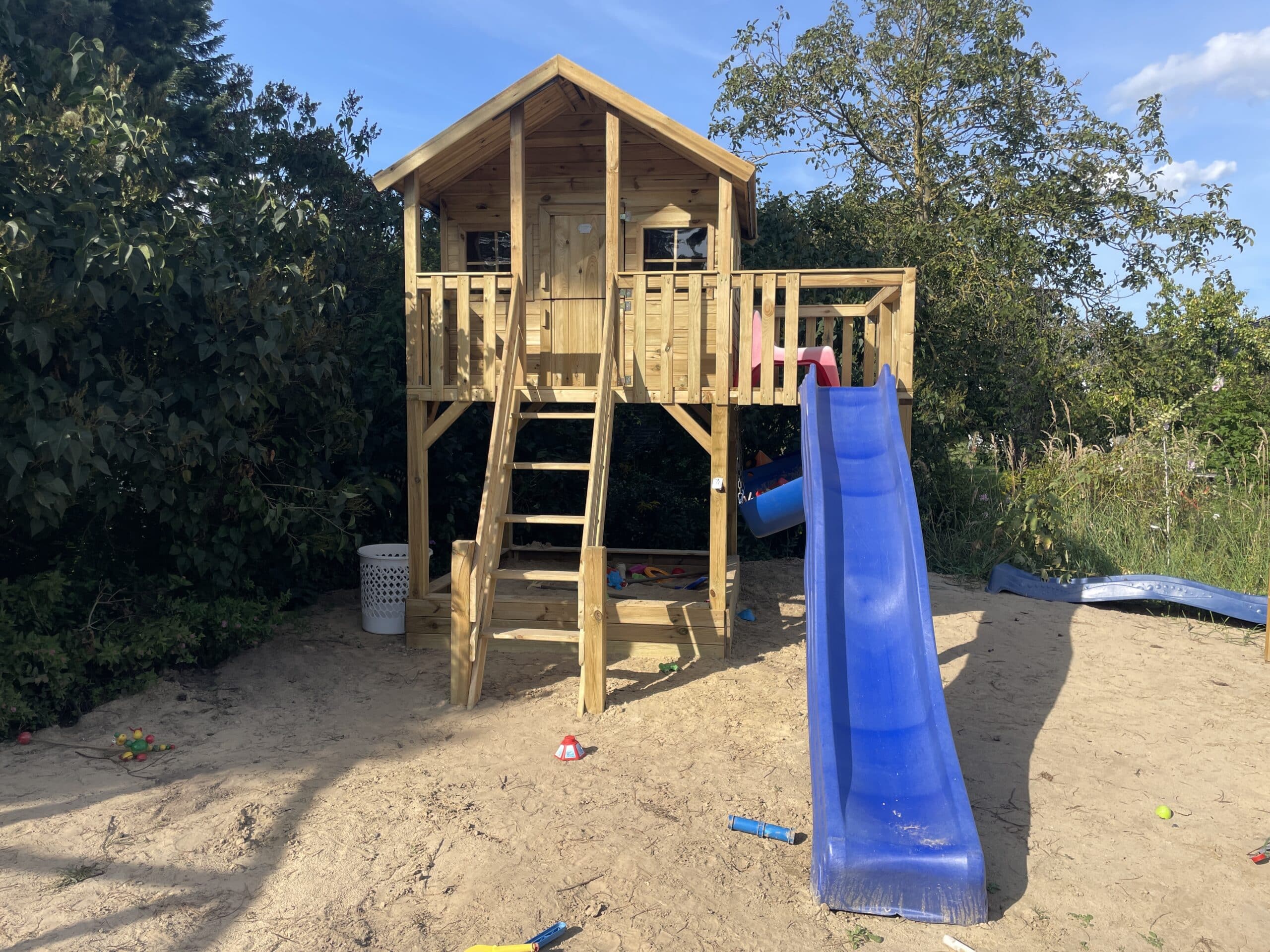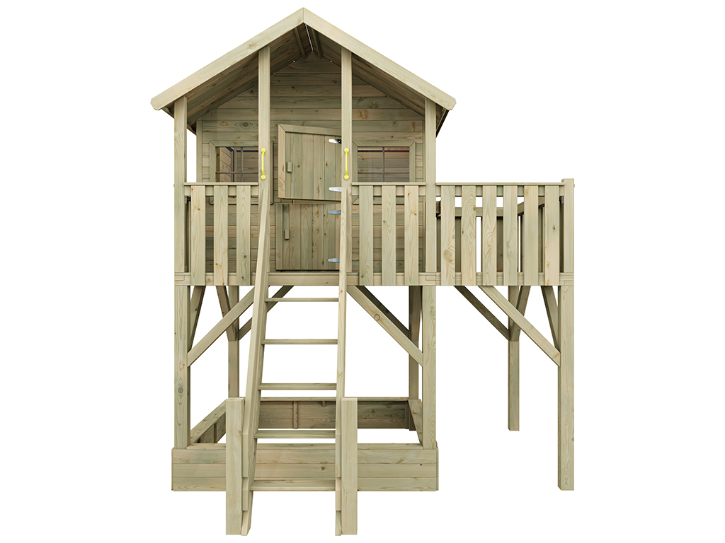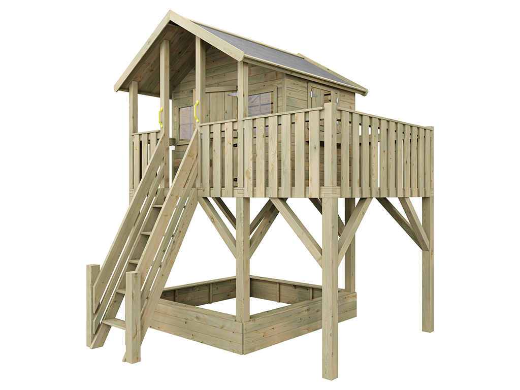 Das große Stelzenhaus wird mit Einzeltür, Fenster, Leiter und Sandkasten geliefert und sorgt für großes Spielvergnügen bei den Kindern.