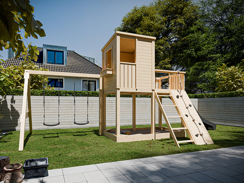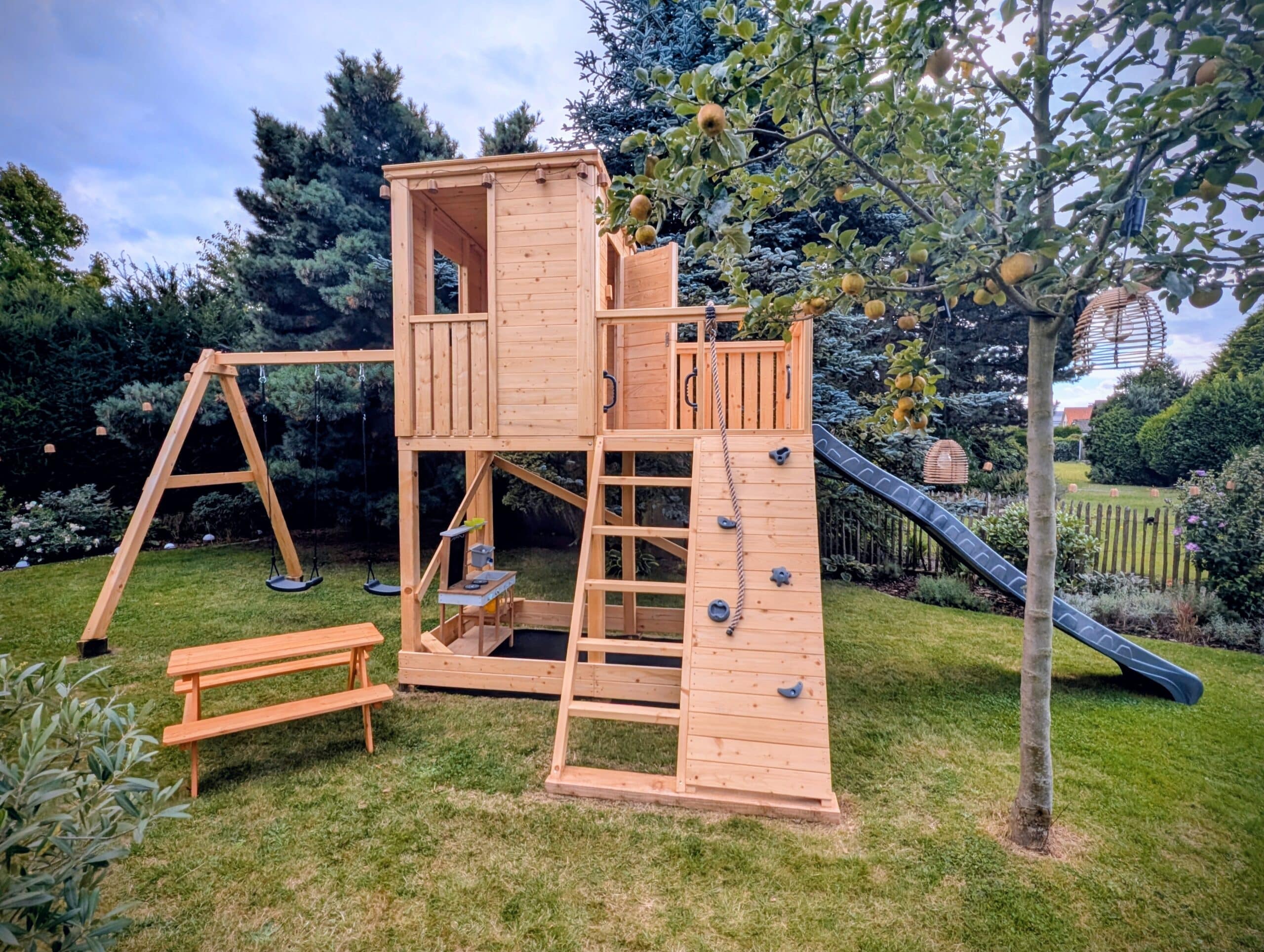 Dieser Spielturm ist aus Holz gefertigt. Der Naturstoff ist das perfekte Material für Kinderspielgeräte – strapazierfähig und beständig. Für die Herstellung wurde erstklassiges Fichtenholz verwendet. Fichte ist besonders langlebig und robust, was für die notwendige Stabilität sorgt. Das Holz ist naturbelassen und unbehandelt, somit frei von chemischer Imprägnierung und absolut unbedenklich. Um die Langlebigkeit und Witterungsbeständigkeit des Holzes zu gewährleisten, empfehlen wir eine Behandlung mit einem Holzschutzmittel wie Lack oder Lasur. Unbehandeltes Holz eignet sich zudem hervorragend für einen farbenfrohen Anstrich.