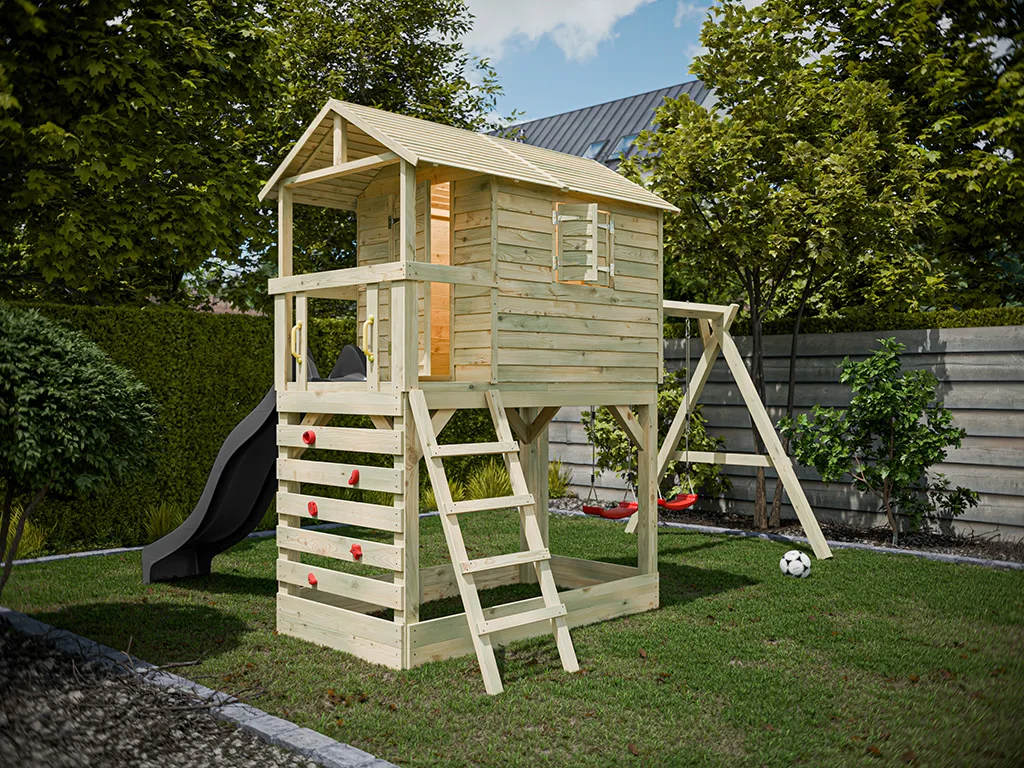 Das lebendige Stelzenhaus Luis bietet einen wunderbaren Platz für Ihre Kinder zum Spielen und Toben. Auf engstem Raum entsteht ein Spielparadies - Raum für Bewegung und Fitness der Kids. Optisch auffallend sind die Wände mit den überlappenden Lamellen.