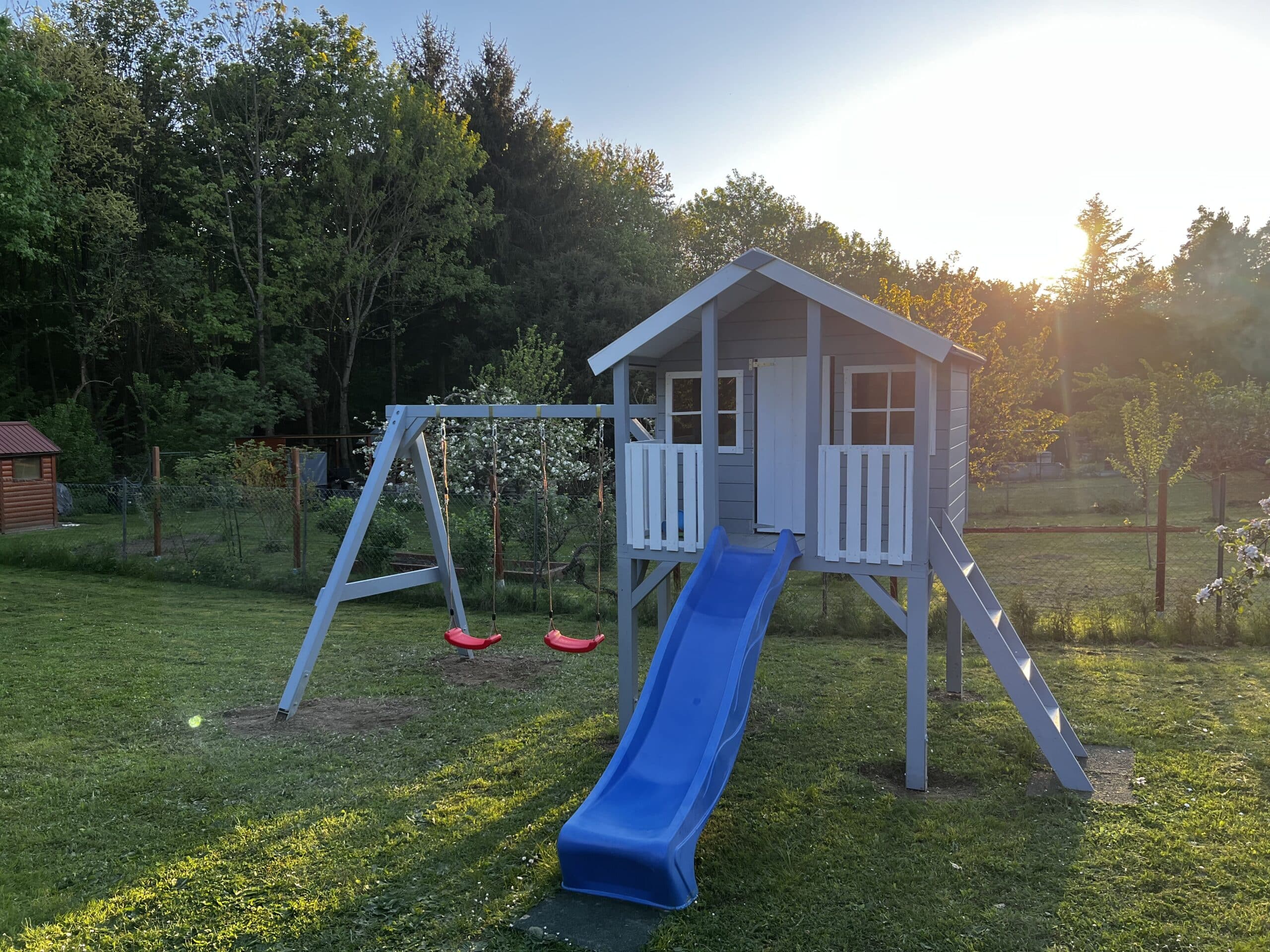 Tolles Stelzenhaus inkl. Wellenrutsche und Doppelschaukel.