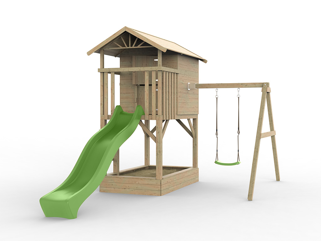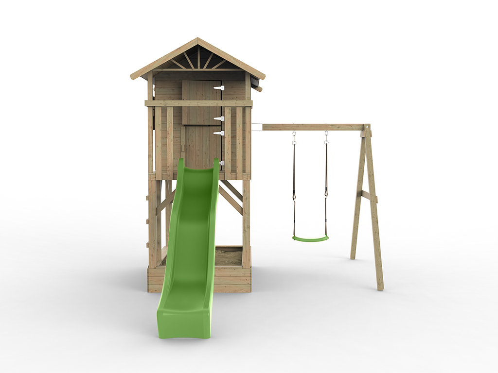 Das Spielhaus wird mit Einzelschaukelanbau inklusive einem grünen Schaukelsitz geliefert.
