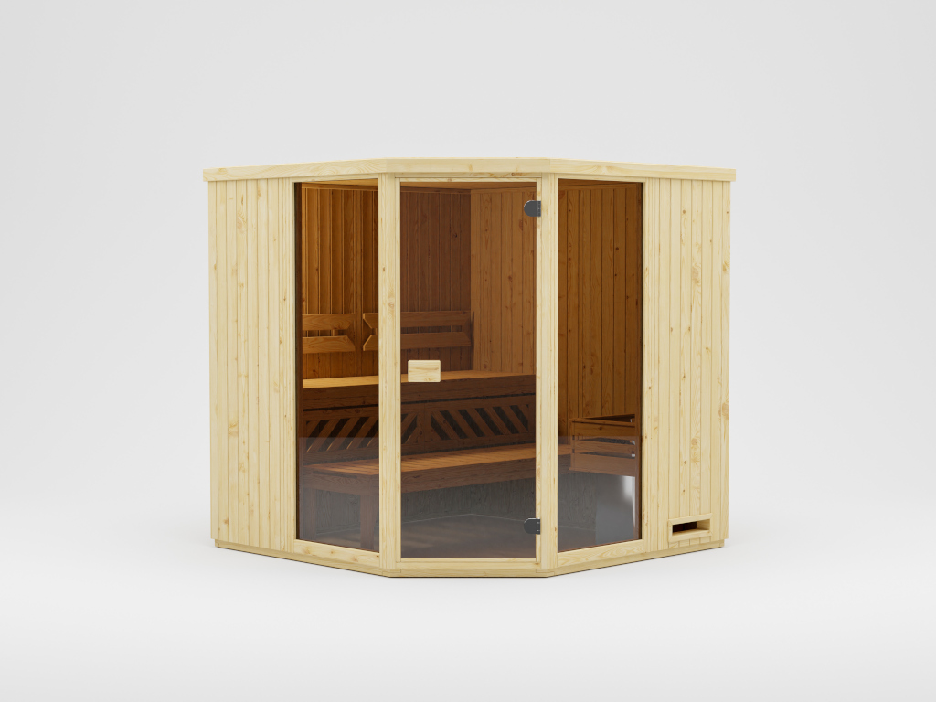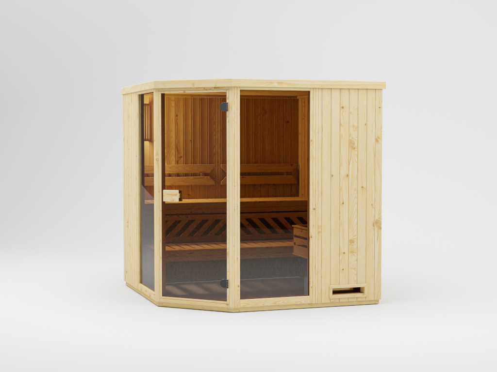 - Eckeinstieg: Saunen dieser Form machen sich besonders gut in kleinen Räumen, da sie platzsparend sind, aber trotzdem viel Freiheit zum Saunieren bieten. Kompakt und in nahezu jeden Raum integrierbar!
