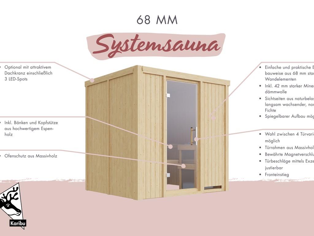 Die Außenwände der Sichtseiten bestehen aus zwei 12,5 mm starken Holzschichten aus atmungsaktivem feuchtigkeitsausgleichendem Spezial-Softline-Profilholz und einer 42 mm dicken Dämmschicht aus Mineralwolle. Das 57 mm starke Dach ist mit einer Spezialplatte und Mineraldämmwolle ausgestattet. Mit einer Wandstärke von 68 mm sind Systemsaunen optimal isoliert und somit besonders energiesparend. Wegen der sehr gut gedämmten Elemente heizt sich die Systemsauna extra schnell auf.