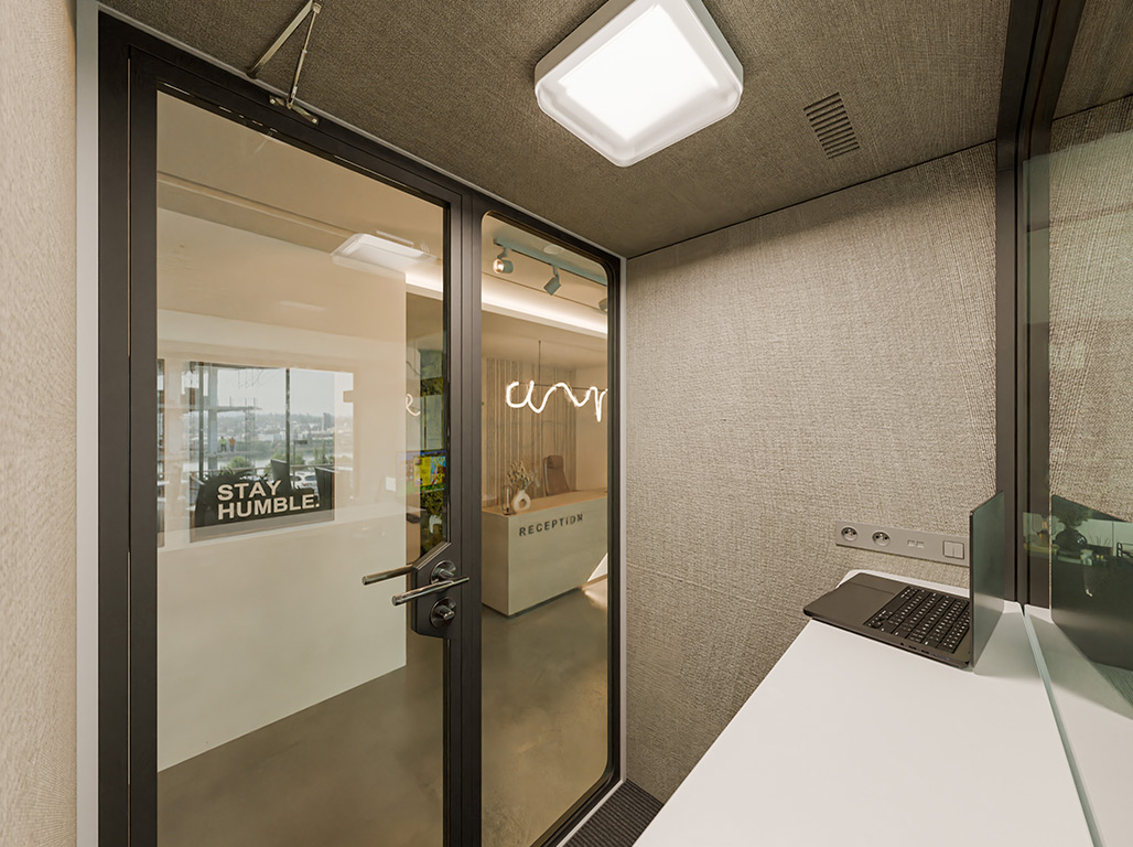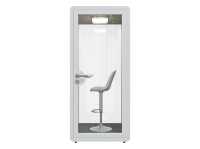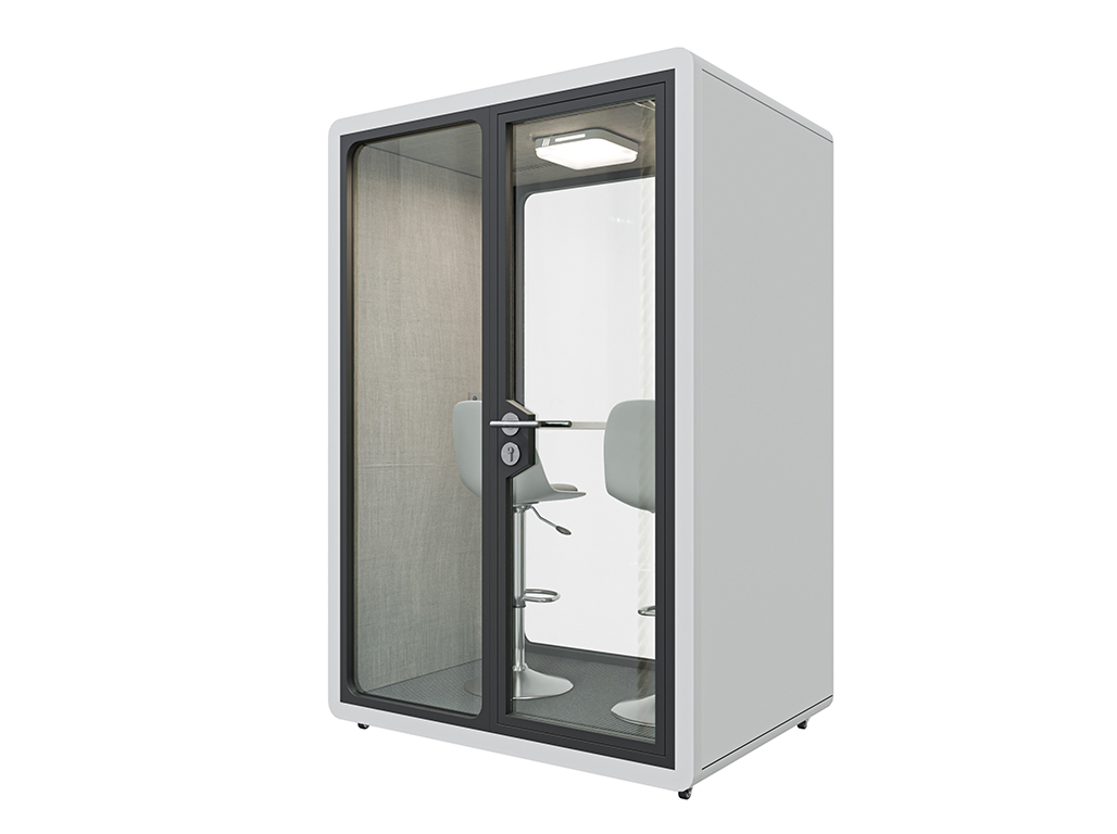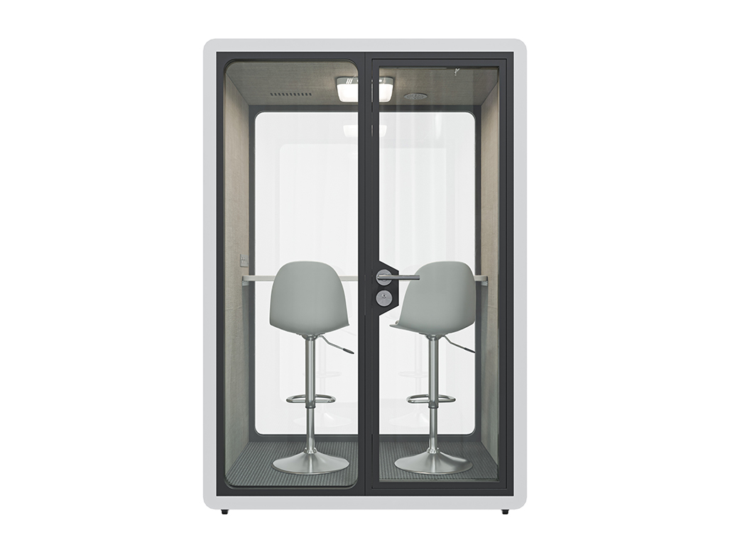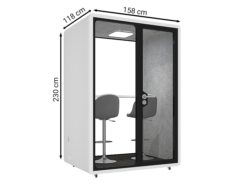 Die Telefon- und Meetingbox Secundo bietet eine effektive Rückzugsmöglichkeit für ungestörte Gespräche oder fokussiertes Arbeiten in offenen Büroumgebungen. Mit ihren kompakten Außenmaßen von 158,8 x 118,8 x 230 cm (L x T x H) ist sie für zwei Personen ausgelegt und lässt sich flexibel im Raum positionieren. Die Kombination aus schallgedämmter Konstruktion (Reduktion um 35 Dezibel) und doppelverglaster Tür sorgt für eine ruhige Atmosphäre im Inneren – ideal für Telefonate oder virtuelle Meetings.
