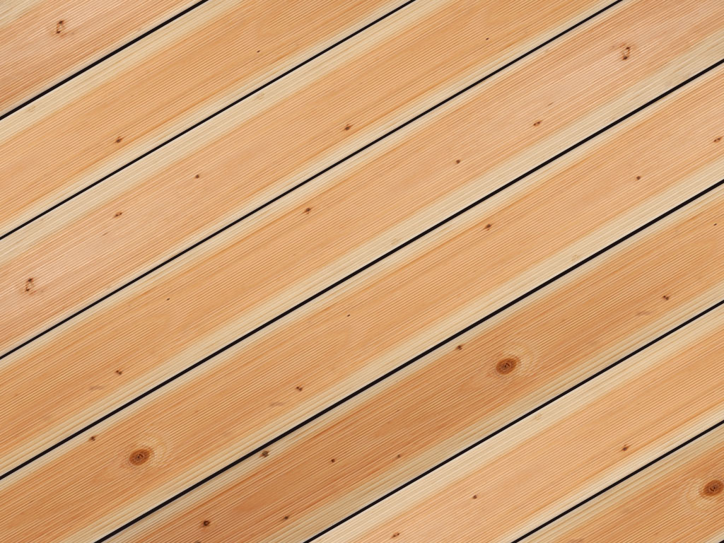 Diese 28 mm starken Terrassendielen werden aus Douglasie hergestellt. Die Douglasie gehört zur Gattung der Nadelbäume und ist in der Dauerhaftigkeitsklasse 3 anzusiedeln. Ihr bräunlich-rotes bis gelbliches Holz verfügt über eine starke Maserung mit ausgeprägten Jahresringen, was ein strukturiertes und lebhaftes Holzbild zur Folge hat. Der Einsatz im Schiffsbau unterstreicht die enorme Widerstandskraft von Douglasienholz gegenüber Umwelteinflüssen, was sie u. a. dem geringen Quell- und Schwindverhalten verdankt. Bei der Befestigung sollten Edelstahlschrauben statt Eisenschrauben verwendet werden, da es sonst zu Korrosionsverfärbungen kommen kann.