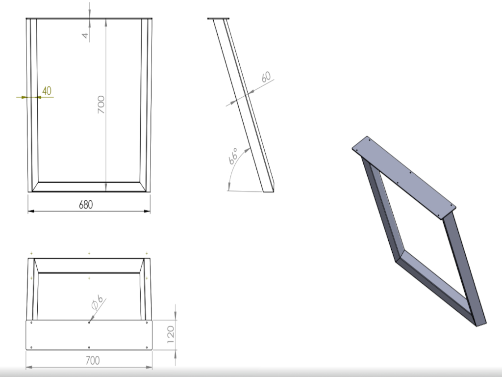 geneigte Kufe - Schräg 66°, Höhe: 700 mm, Profilstärke: 60 × 40 mm, Breite am Boden: ca. 680 mm