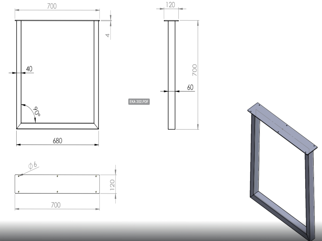 Kufenform, Höhe: 700 mm, Profilstärke: 60 × 40 mm, Breite am Boden: ca. 680 mm