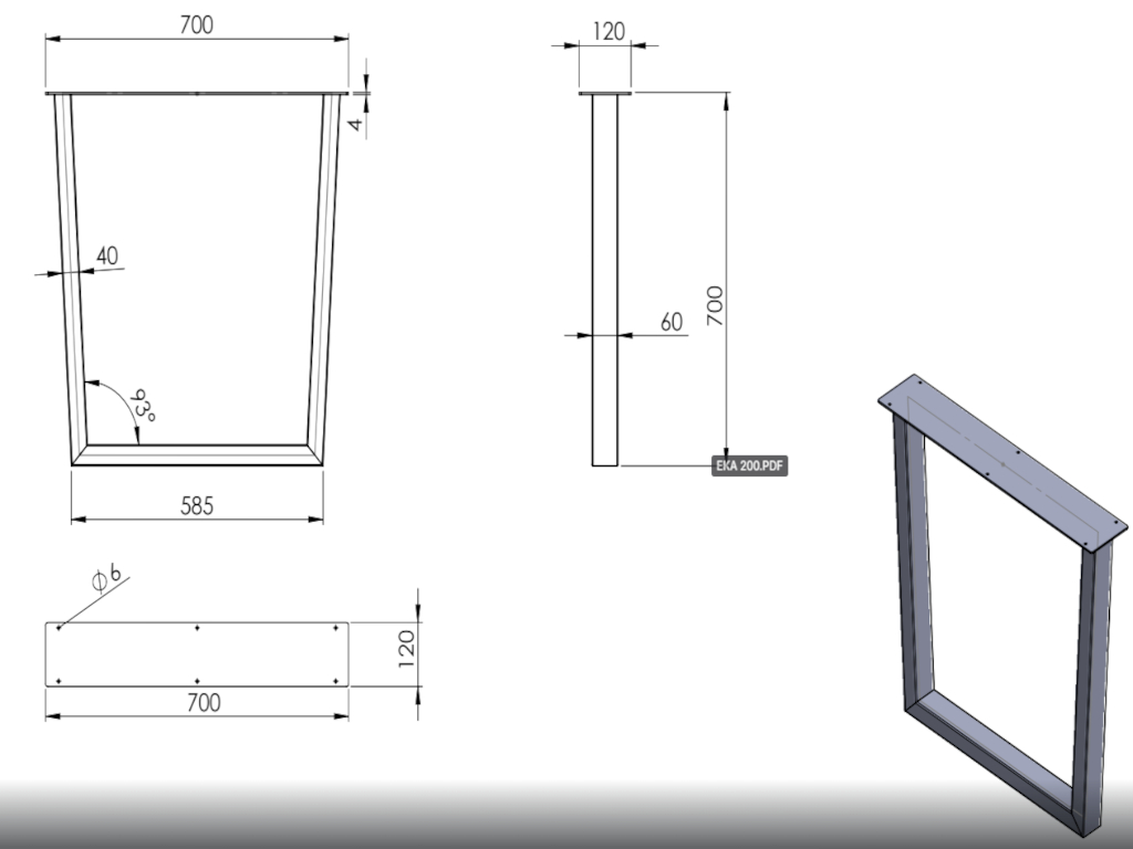 Trapezform, unten schmal/oben breit, Höhe: 700 mm, Profilstärke: 60 x40 mm, Breite am Boden ca. 585 mm