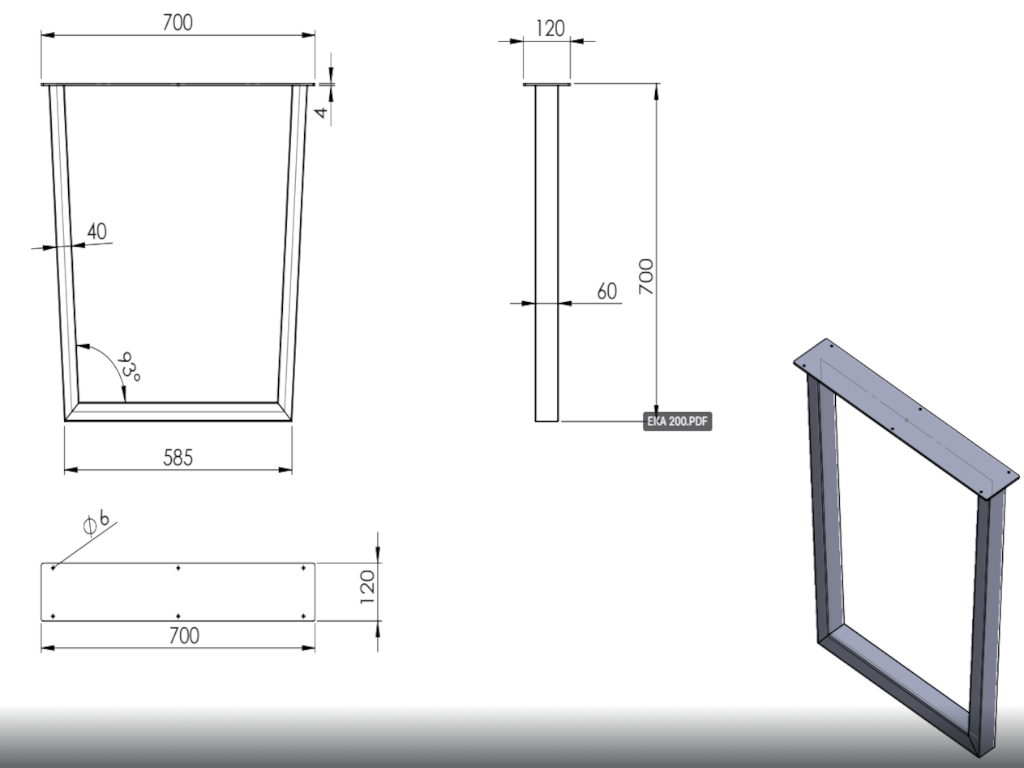 Trapezform, unten breit/oben schmal, Höhe: 700 mm, Profilstärke: 60 x40 mm, Breite am Boden ca. 700 mm