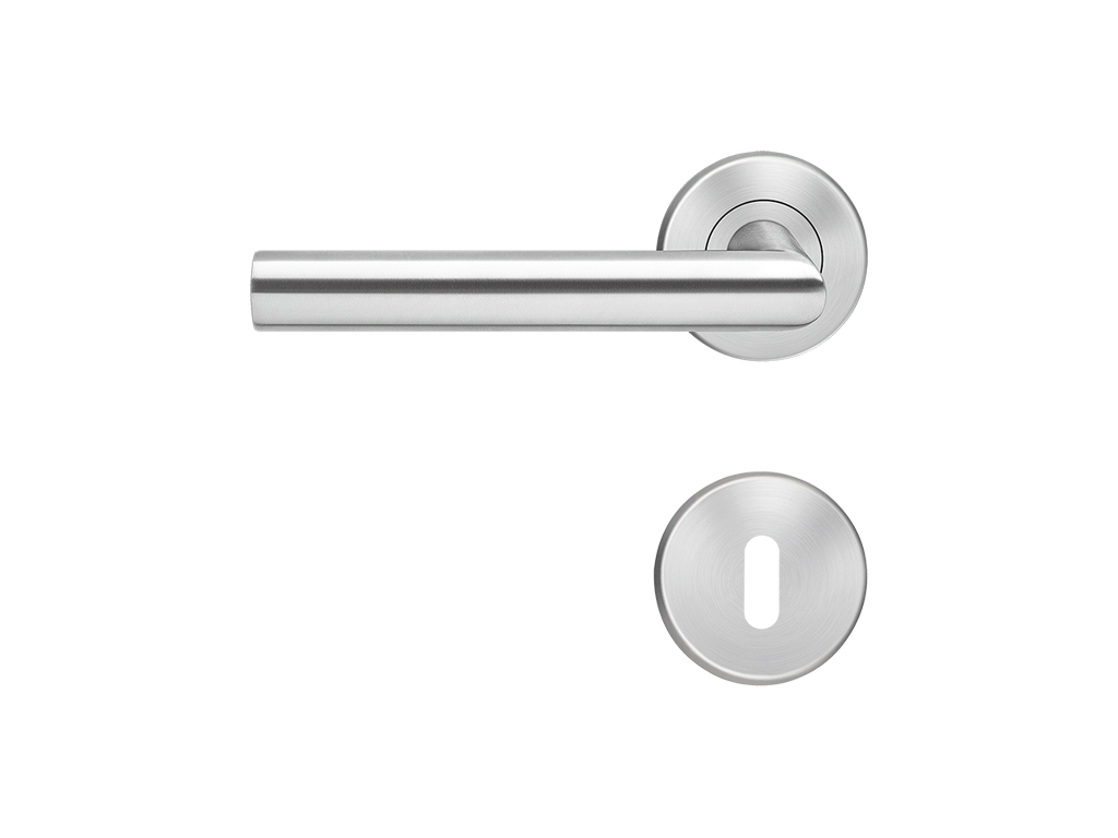 Drückergarnitur in Buntbartausführung mit rundem L-Form-Griff und runden Klipprosetten, Edelstahl matt.