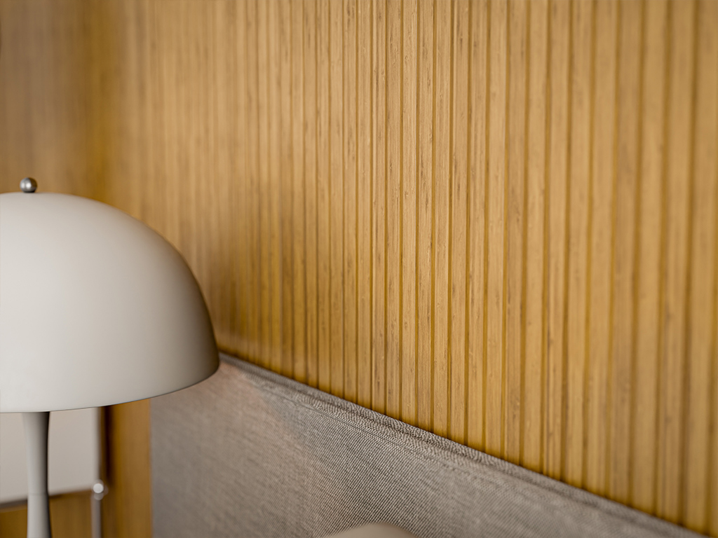 Die Wandpaneele sind aus Echtholz gefertigt. Hierbei handelt es sich um Bambus. Dieser überzeugt durch seine gleichmäßige, feine Struktur und die helle, natürliche Farbgebung. Neben seiner optischen Wirkung punktet er mit sehr guten technischen Eigenschaften: Er ist besonders stabil, formbeständig und widerstandsfähig gegenüber Abnutzung. Auch bei Schwankungen von Luftfeuchtigkeit zeigt Bambus nur ein geringes Schwind- und Quellverhalten, verzieht sich kaum und neigt nicht zu Rissbildungen. Bambus wächst bis zu einem Meter pro Tag und ist somit eine sehr nachhaltige und umweltfreundliche Wahl.