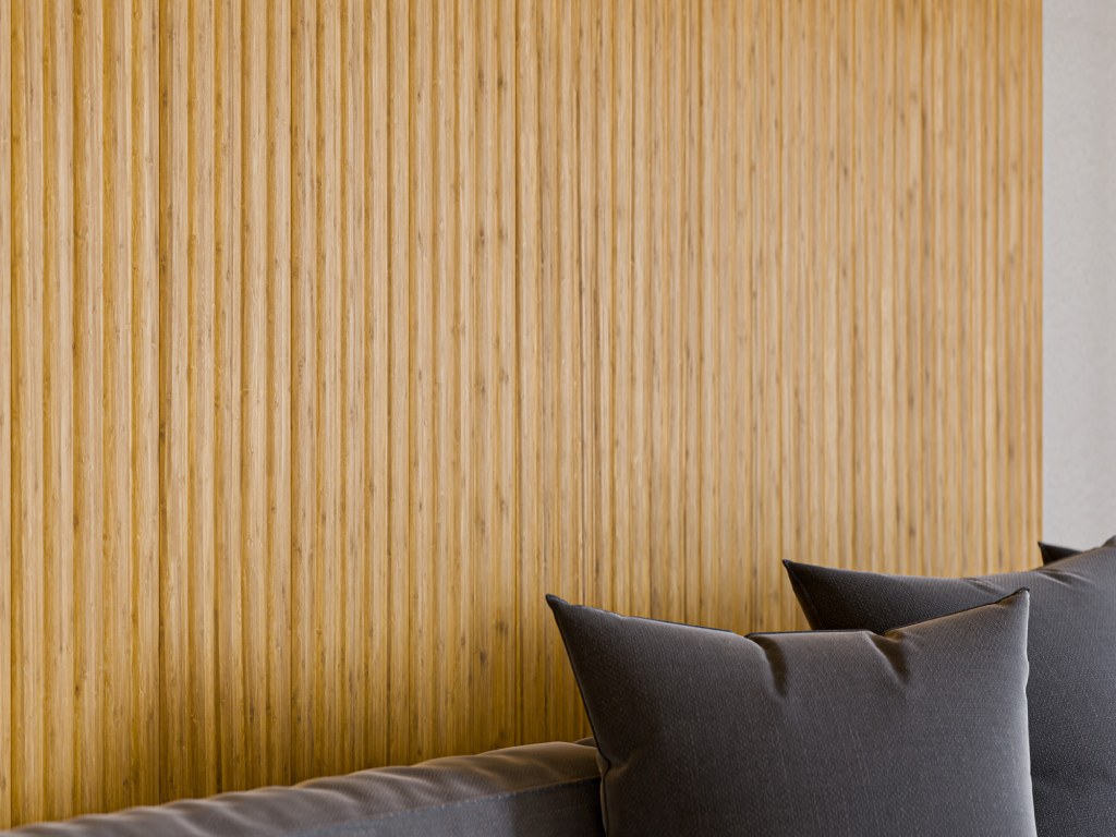 Die Bambus-Wandpaneele werden auf eine Sperrholzunterkonstruktion montiert, indem man sie Nut-auf-Feder zusammensteckt und anschließend unsichtbar mit kopflosen Stiftnägeln im 40–50°-Winkel durch Nut oder Feder ins Sperrholz schießt. Du kannst die Paneele sowohl vertikal als auch horizontal anbringen.