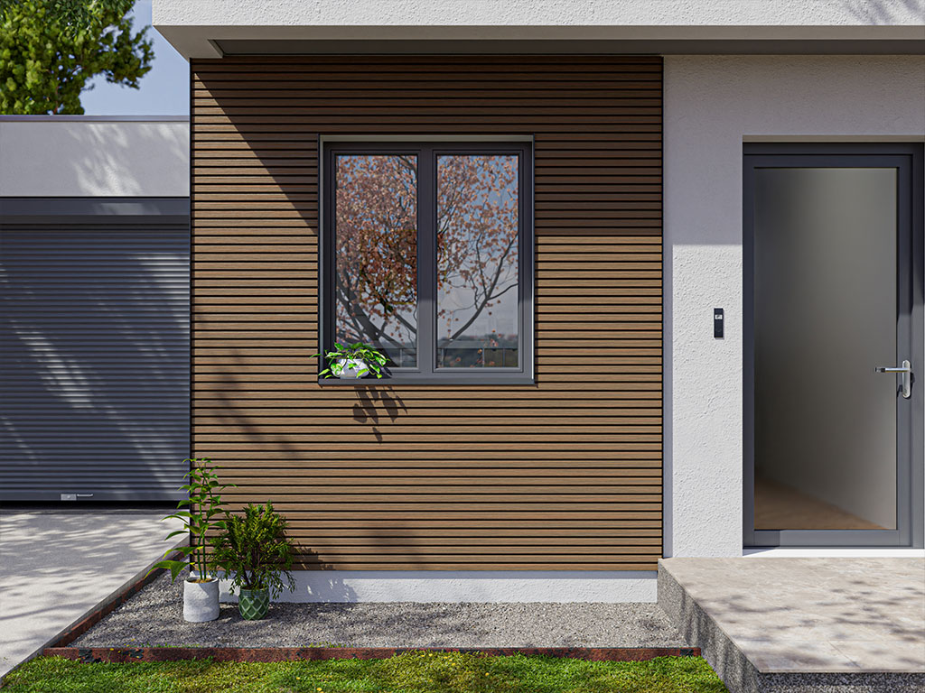 Bei einer coextrudierten Fassadenverkleidung wird der WPC-Kern komplett mit Kunststoff ummantelt. Dadurch wird die Beständigkeit gegen Feuchtigkeit, Schimmel und Insekten noch erhöht. Gleichzeitig sorgt das Verfahren dafür, dass die äußere Schicht länger schön bleibt.