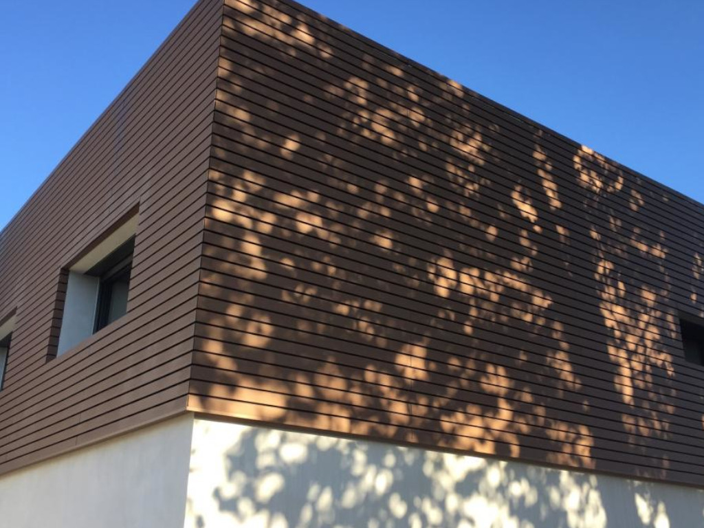 Die Fassadenverkleidung wird aus WPC hergestellt. WPC (Wood Plastic Composite) ist eine Verbindung aus Holz und Kunststoff mit vielen Vorteilen. Dieser Verbundwerkstoff ist nicht nur leicht zu pflegen und reinigen, sondern auch witterungsbeständig, form- und farbstabil, splitterfrei und rutschfest – die ideale Fassadenverkleidung. Außerdem zeichnet er sich durch die hohe Dichte aus, die ihn gut vor Insektenbefall schützt.