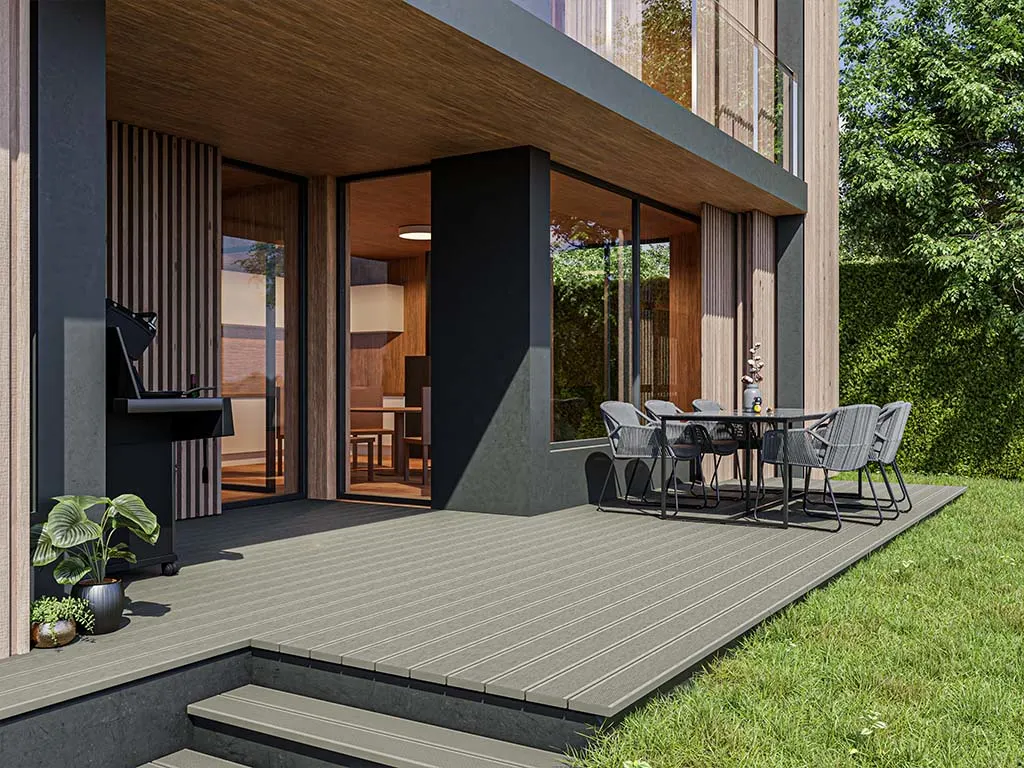 Diese 26 mm starke Terrassendielen werden aus WPC hergestellt.