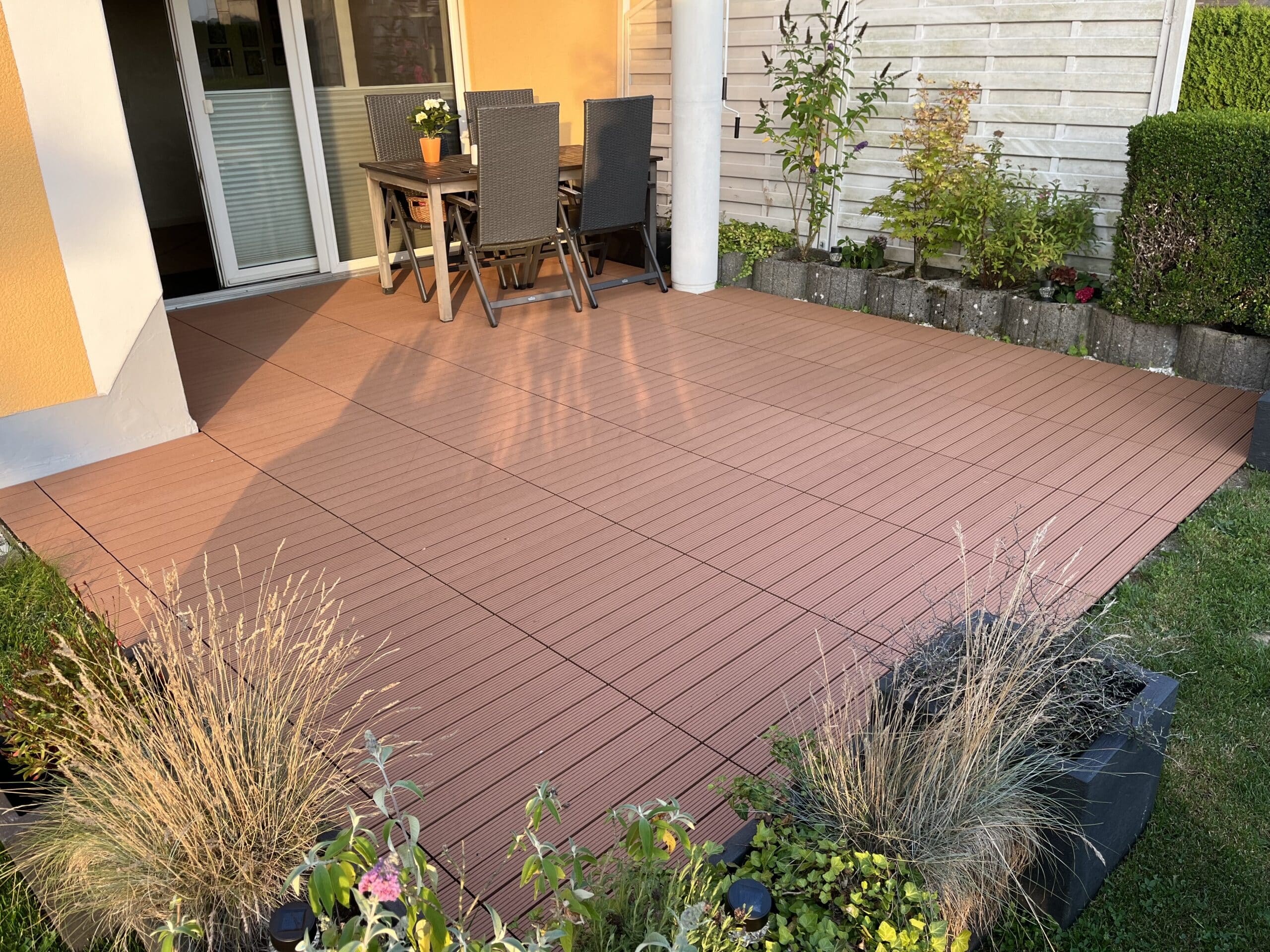 Ideal auch für den Barfußbereich einsetzbar. Die Kombination von Holz und Kunststoff verleiht der Terrasse eine hohe Qualität, so dass du lange Freude an deiner Terrasse hast. Das geriffelte Profil der Terrassenfliese wirkt rutschhemmend und sorgt für ein angenehmes Geherlebnis.