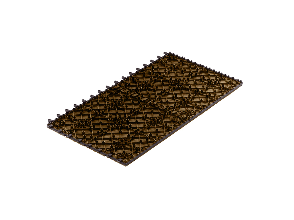 Der Boden lässt sich sehr leicht verlegen und ebenso wieder demontieren. Die Fliesen sind auf einem Trägerrost aus Kunststoff montiert und werden nur zusammengesteckt.
