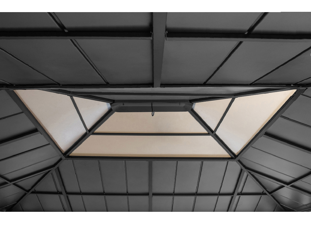 Der rechteckige Gazebo hat eine Breite von 393 cm, eine Höhe von 287 cm und eine Tiefe von 452 cm. Orientiere dich für die Erstellung des Fundaments am Grundriss bzw. an der mitgelieferten Montageanleitung.