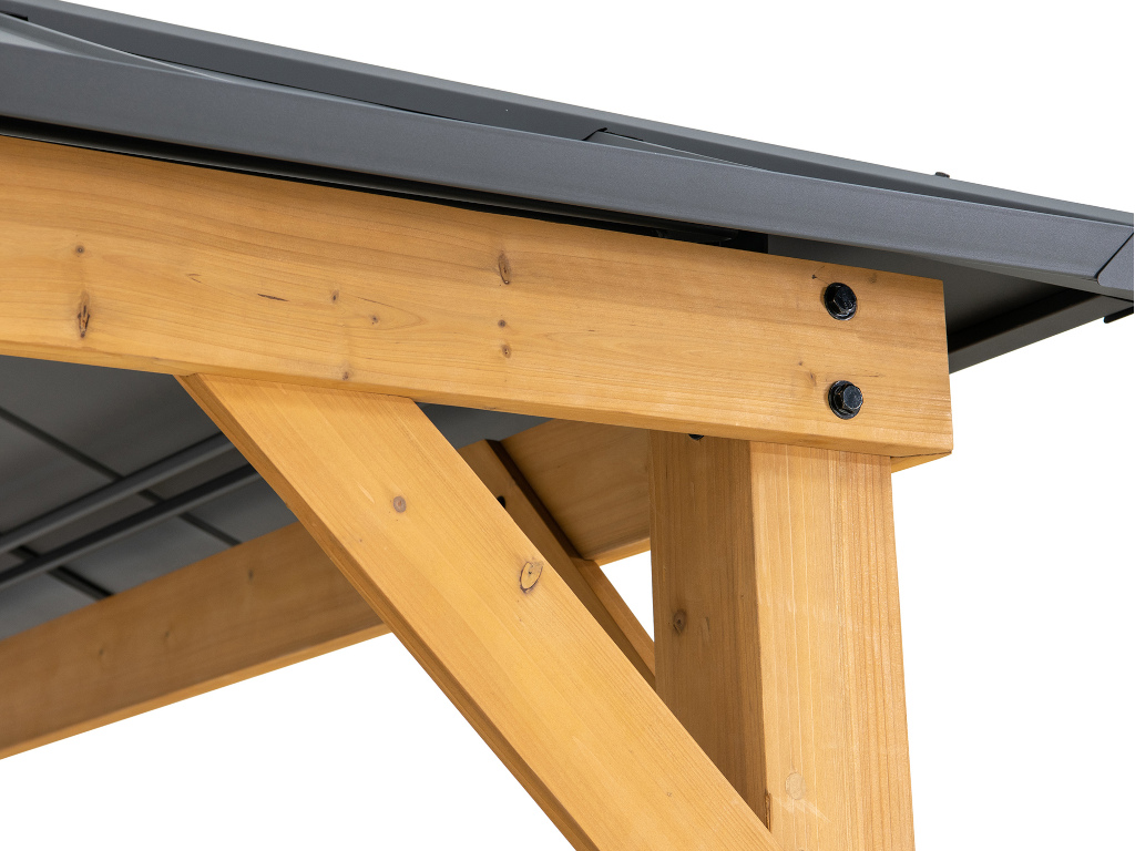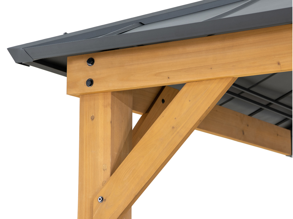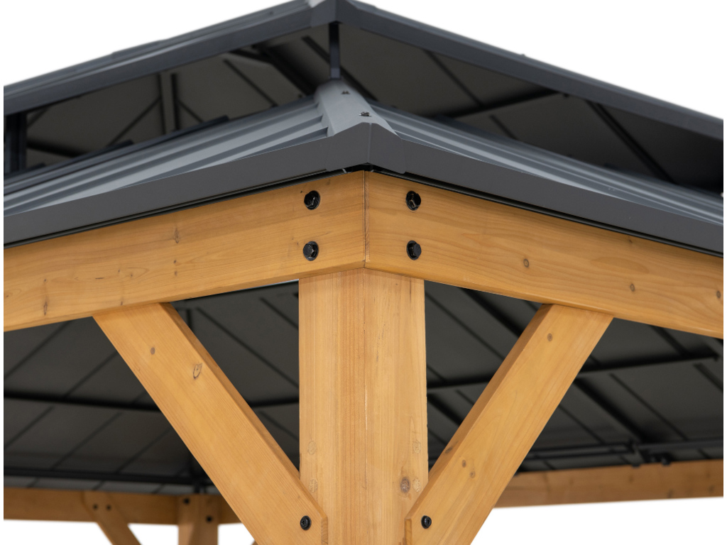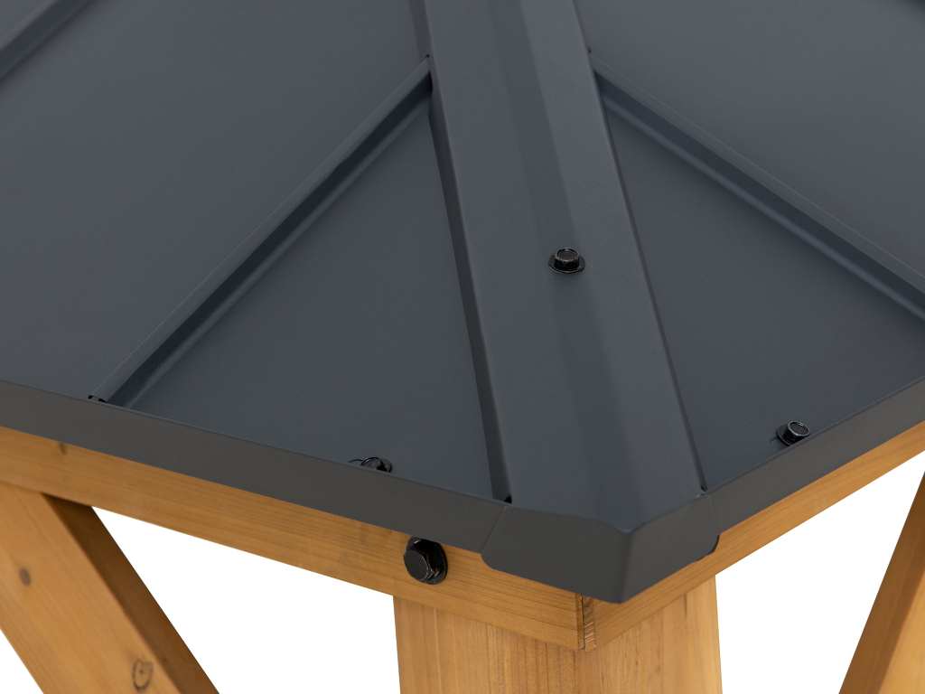 Der offene Gazebo ist aus hochwertigem Zedernholz gefertigt. Zeder gilt als besonders widerstandsfähig und langlebig. Die Oberfläche ist unbehandelt. Wir empfehlen einen jährlichen Anstrich mit Beize auf Wasser- oder Ölbasis. Das Walmdach besteht aus robustem Stahl/Polycarbonat und verleiht dem Gazebo eine ganz besondere Eleganz. Aber nicht nur in der Ästhetik überzeugt das Walmdach, auch die herausragende Stabilität spricht für diese Dachform. Eine geringere Angriffsfläche für Wind und Sturm als beispielsweise bei einem Satteldach erhöht die Lebensdauer dieses Daches. Somit kannst du dich besonders lange an diesem schmucken Gazebo erfreuen.