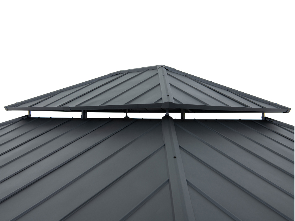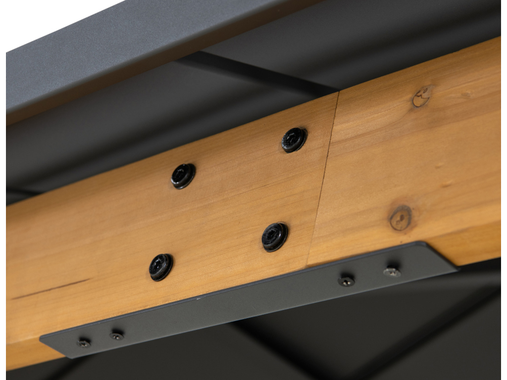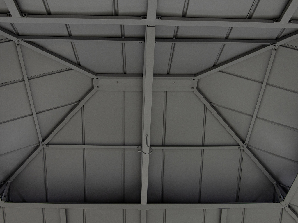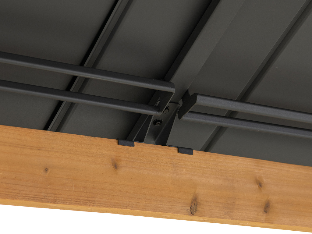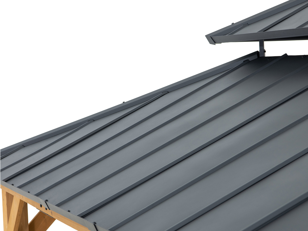Der offene Gazebo ist aus hochwertigem Zedernholz gefertigt. Zeder gilt als besonders widerstandsfähig und langlebig. Die Oberfläche ist unbehandelt. Wir empfehlen einen jährlichen Anstrich mit Beize auf Wasser- oder Ölbasis. Das Walmdach besteht aus robustem Stahl/Polycarbonat und verleiht dem Gazebo eine ganz besondere Eleganz. Aber nicht nur in der Ästhetik überzeugt das Walmdach, auch die herausragende Stabilität spricht für diese Dachform. Eine geringere Angriffsfläche für Wind und Sturm als beispielsweise bei einem Satteldach erhöht die Lebensdauer dieses Daches. Somit kannst du dich besonders lange an diesem schmucken Gazebo erfreuen.
